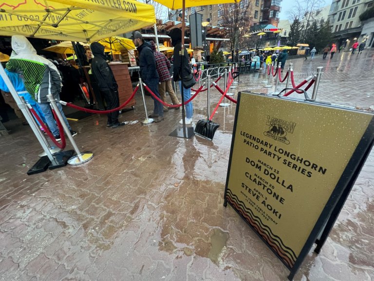 アメリカでも有名で人気のあるDJ、スティーブ・アオキ氏がウィスラーでイベントを開催していました。滑り終わって下山するとゴンドラ乗り場の目の前には、普段からDJがアプレを盛り上げて賑わっている「Longhorn」というパブがあります。その前を通った時、いつもより大がかりなステージをセットされていて大勢