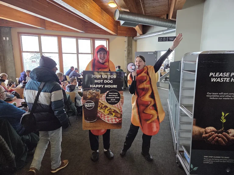スキーやスノーボードでお腹が空いたとき、山の上での食事代が割高に感じることはよくあります。しかし、ウィスラー・ブラッコムのレストランには、驚くほどコスパが良い「裏メニュー的」なサービスが存在します。 それが、毎日午後2時から開催される「ホットドッグハッピーアワー」です! 規格外のサイズ!「フットロン