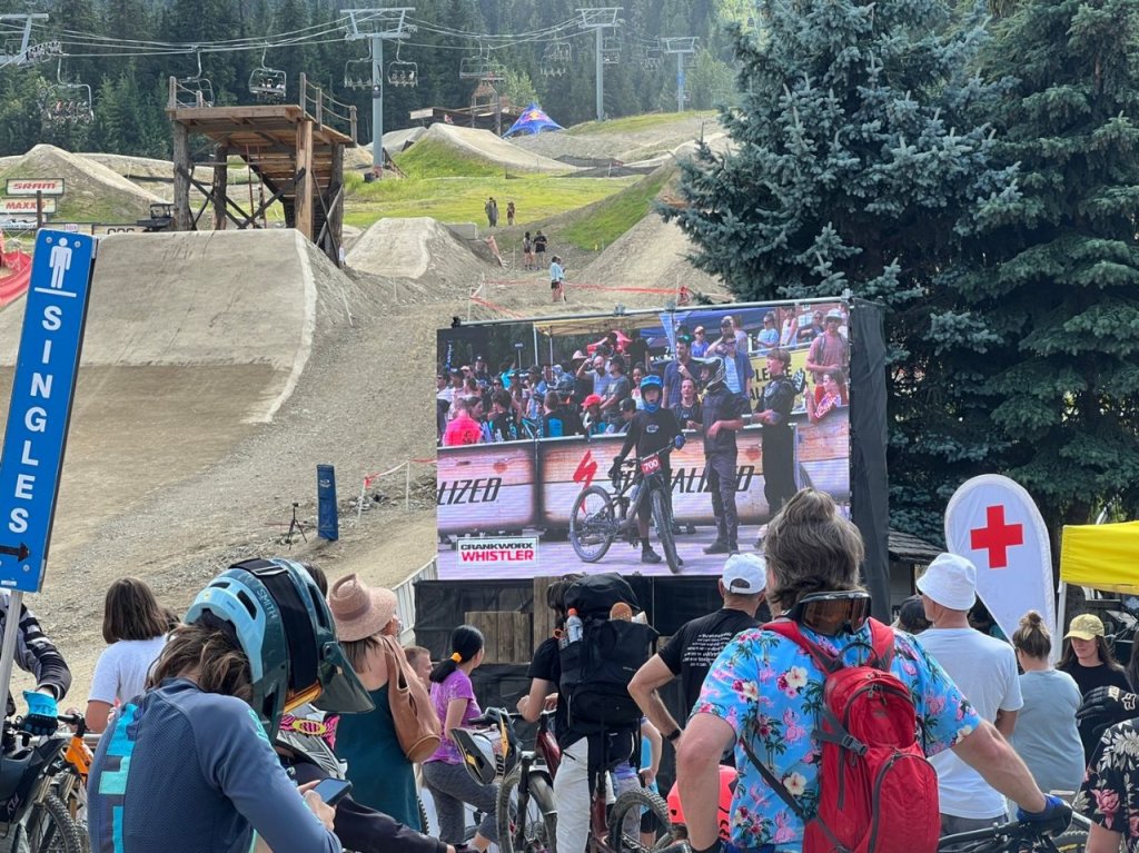 マウンテンバイクの大会は、実際は山の中にあるトレイルで行われています。もちろん、興味がある方は観戦ポイントまで行って観ていますが、登ったりするのが大変というかたはパブリックビューイングでも観戦できます♪ゴール地点に大きなモニターがあ、モニターで見ていた選手がまさに目の前に現れインタビューを受けたりするので、臨場感たっぷりの現地での盛り上がりが味わえますよ!