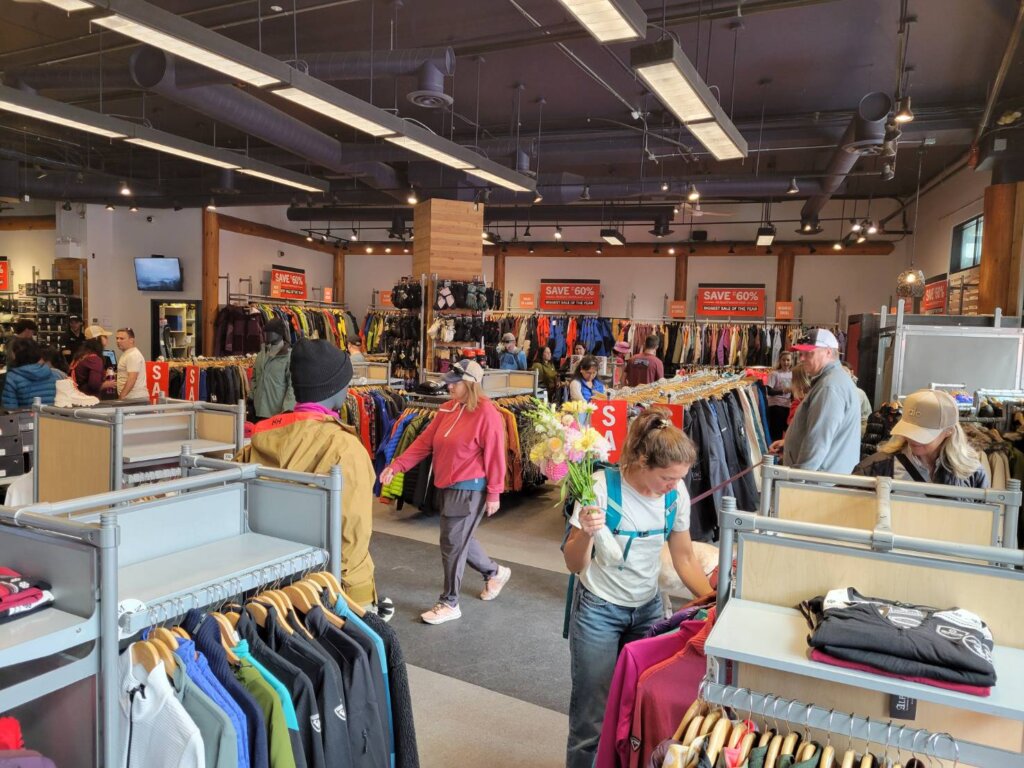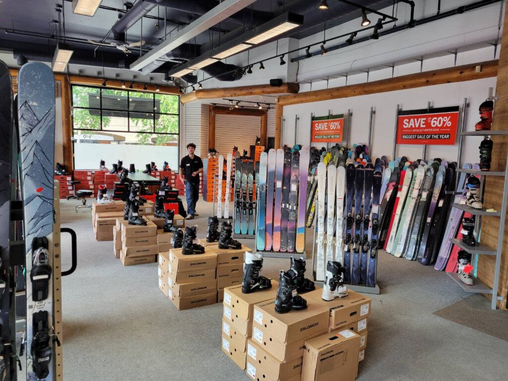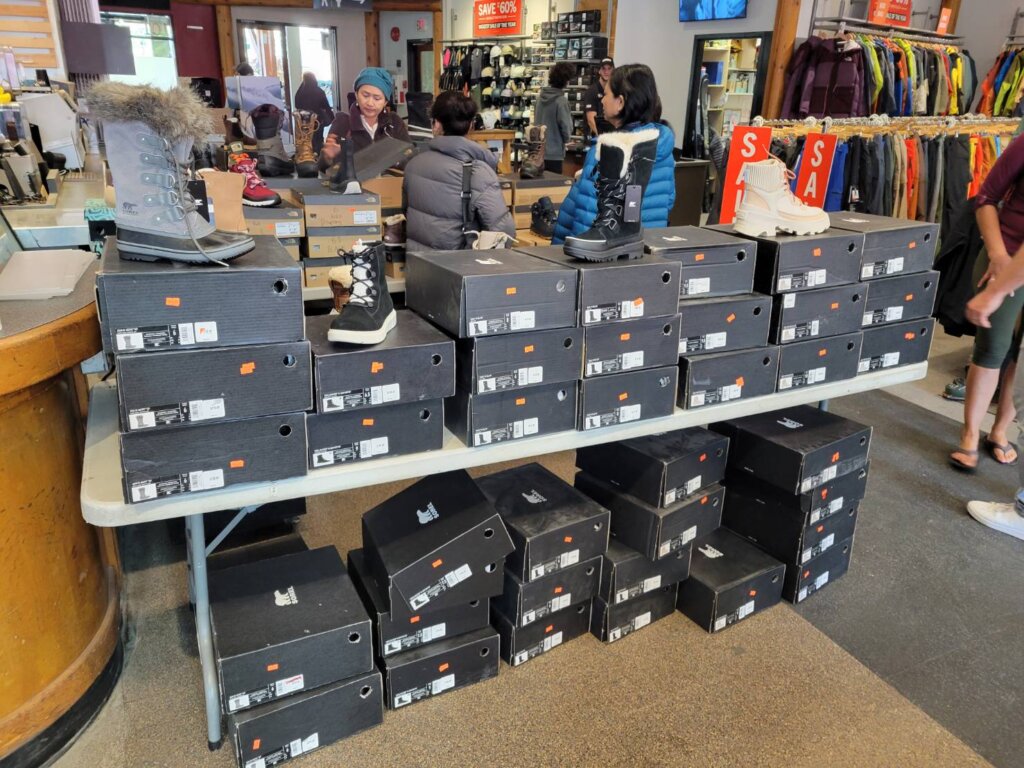 主なセール品は、レンタル落ちのスキー板(バインディング付き)、スキー板、スキーブーツ、ウェアや冬物衣料、ゴーグル、グローブ、ヘルメット、冬用ブーツ(Sorelなど)です。スノーボードの板やブーツは見かけませんでしたので、そちらはおそらく近日中に、スノーボード用品専門店「Showcase」でセールが始まると思われます。
