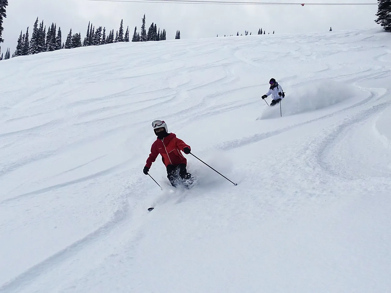 ゴンドラを降りると少し冷え込んだ空気と新雪が。10cmとはいかないものの5cm以上はあり、スキー板の上に乗った雪もサラサラっと流れていくくらいのパウダースノーでした。滑り出すと昨日までの圧雪の上にパウダースノーが乗っているので、新雪に慣れていない方でも滑りやすいコンディション♪スピードに乗ってターンをすればスプレーが舞い、ファーストトラックス参加者も少なかったおかげで、思いがけずしっかり3本もトラックがほとんどついていないフレッシュな雪を堪能できました。