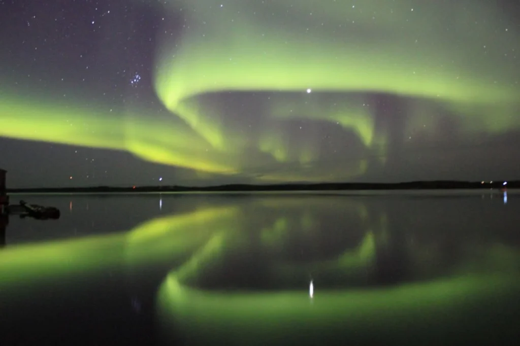 イエローナイフで夏のオーロラ!?湖面に映るダブルオーロラが眺められるのは夏だけ。滞在中に一度、車でオーロラを追いかけるオーロラハンティング付き!