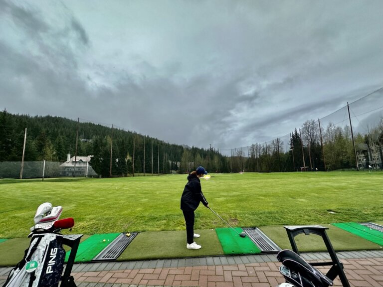 今日は1日雨予報だったため、スノーボードには行かず、今シーズン初の打ちっぱなしに行ってきました。ゴルフのシーズンインです!天気が悪いせいかお客さんも少なく、今年初めてにしてはプレッシャーなく気持ちよく打つことができました。写真の場所はWhistler Golf Clubの打ちっぱなし場で、ゴルフ場は