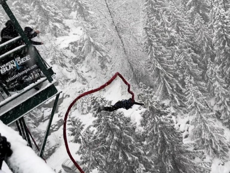 バンジージャンプは夏のアクティビティのイメージがありますが、ウィスラーのバンジージャンプは1年中楽しめます!もちろん、夏も1日に100人以上が飛び降りる人気のアクティビティですが、先日もバンジージャンプポイントまで行くと、勇気あるジャンパーたちが雪が降る中、高さ50mのバンジージャンプを楽しんでいま
