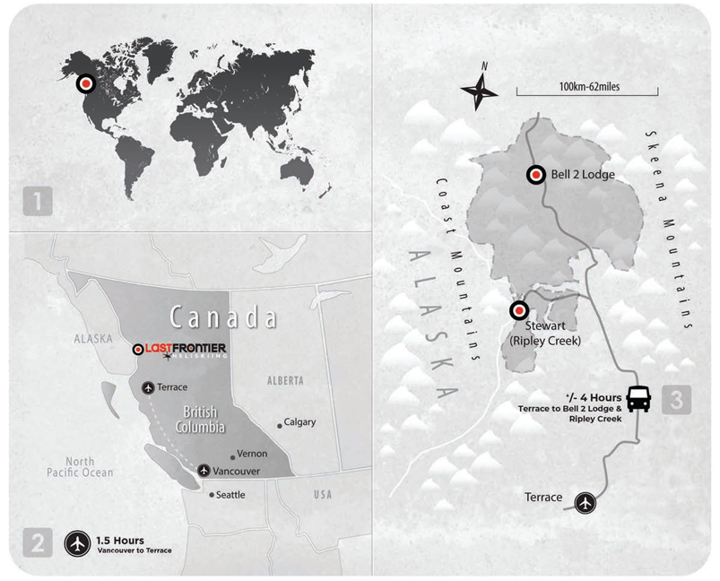 場所はBC州最北部、アラスカとの国境沿いに連なるコーストマウンテンの一角、スキーナ山群。最寄の街まで360Km離れた原野の真中に建てられたログキャビンが宿泊のベースとなります。通常1機のヘリが運ぶのは最大で3グループまで。各グループは4人という、ヘリスキー業界では最小クラスの理想的な人数構成で運営されています。